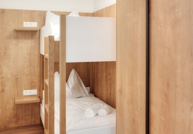 • 1 Schlafzimmer mit Doppelbett, 1 Schlafzimmer mit Etagenbett (Zugang über Schlafzimmer, mit Schiebetüre, ohne Fenster,